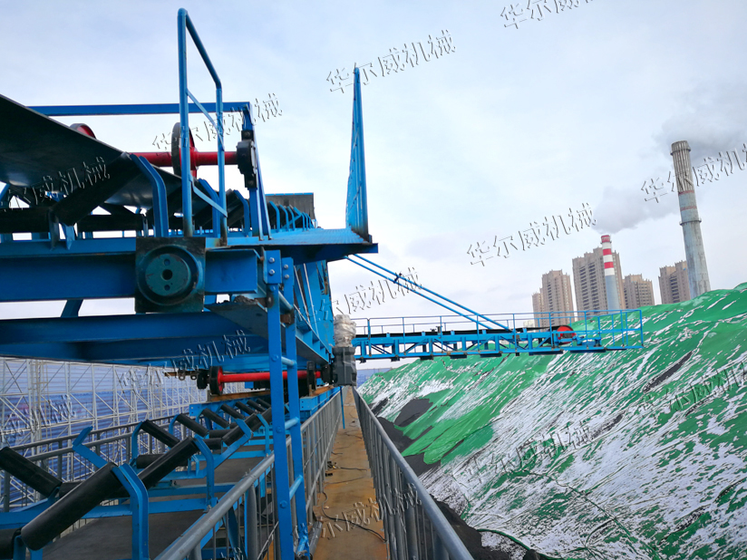 懸臂堆料機設置在普通帶式輸送機上方,普通帶式輸送機上的物料通過懸臂堆料機主體機架提升一定高度后,通過滾筒與漏斗將物料卸料在1#可逆小皮帶機上,1#可逆小皮帶機向一個方向運行時將物料輸送至普通帶式輸送機上的膠帶上;反向運行時,將物料輸送至2#可逆小皮帶機上,通過2#可逆小皮帶機的正反運行,將物料均勻地堆卸在整個料場上。